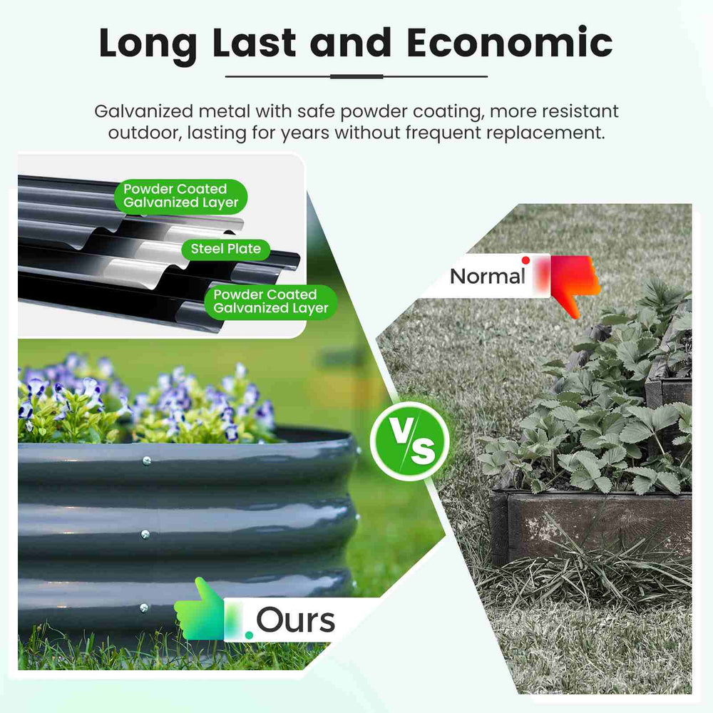 【Sturdy & Durable】The reinforced bar design ensures a stable and sturdy planter raised bed, resistant to soil leakage or collapse. The high-quality galvanized steel material maintains its luster through the years, making it the perfect garden enhancement.