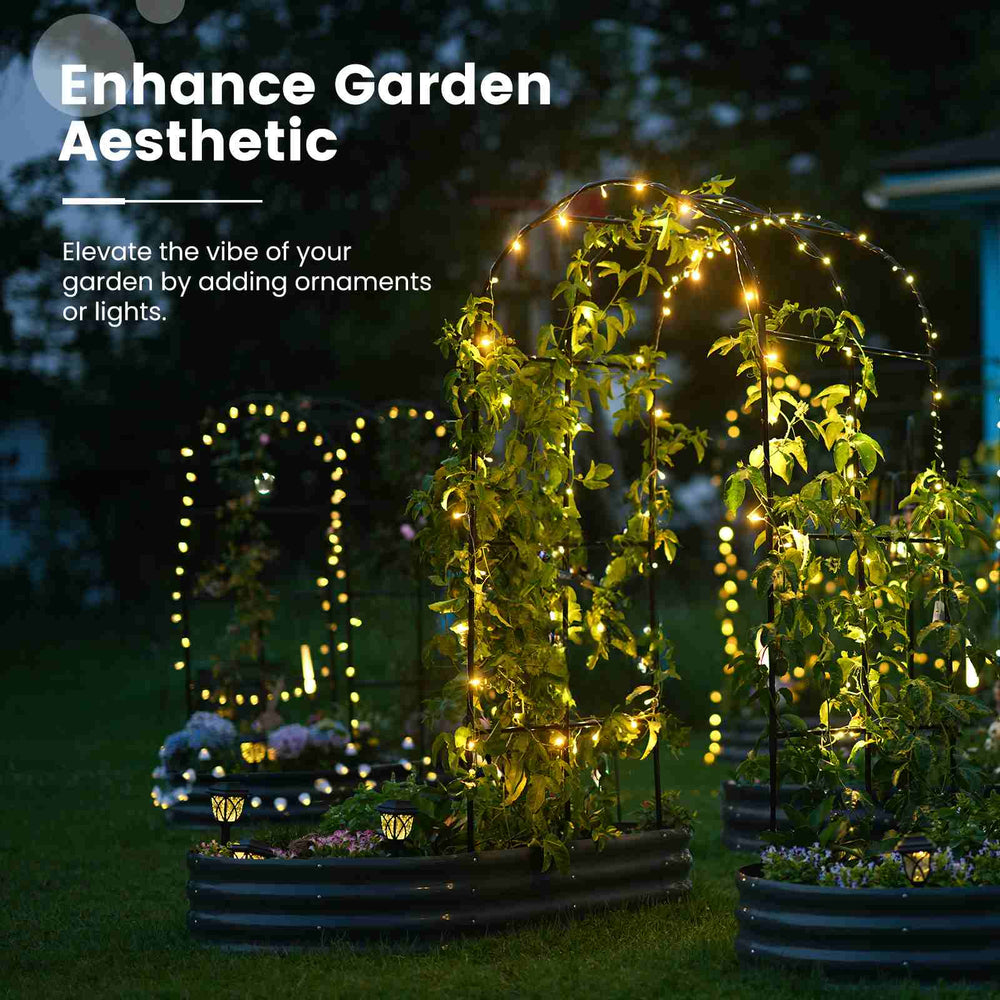 【Comes with Arched Trellis 】Perfect for climbing plants such as tomatos, passion fruit, and offers versatile uses, like hanging tools and flower pots. Adding ornaments or lights will elavate romatic vibe of your garden.