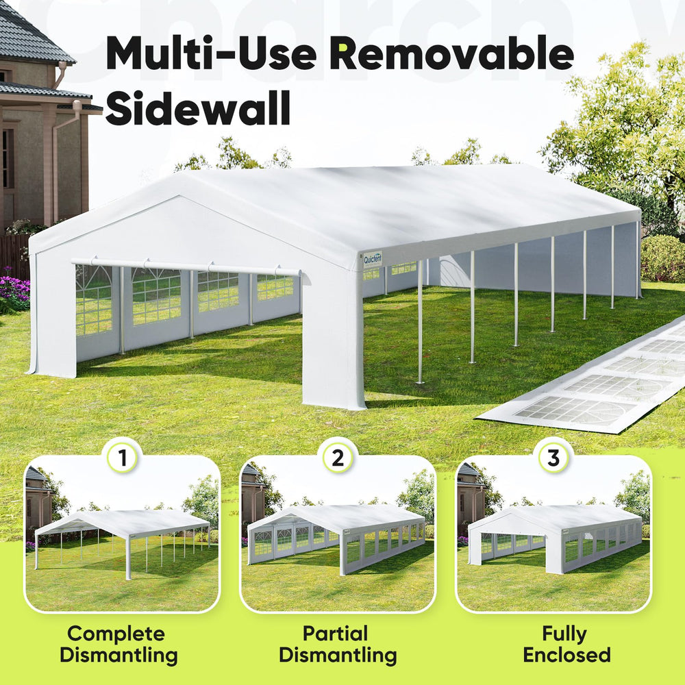【Premium Material】Constructed with 160g imported PE fabric offering complete waterproof and UV protection. The 20x30ft canopy includes 2 removable sidewalls with chapel-style windows and zippered doors for optimal ventilation.
