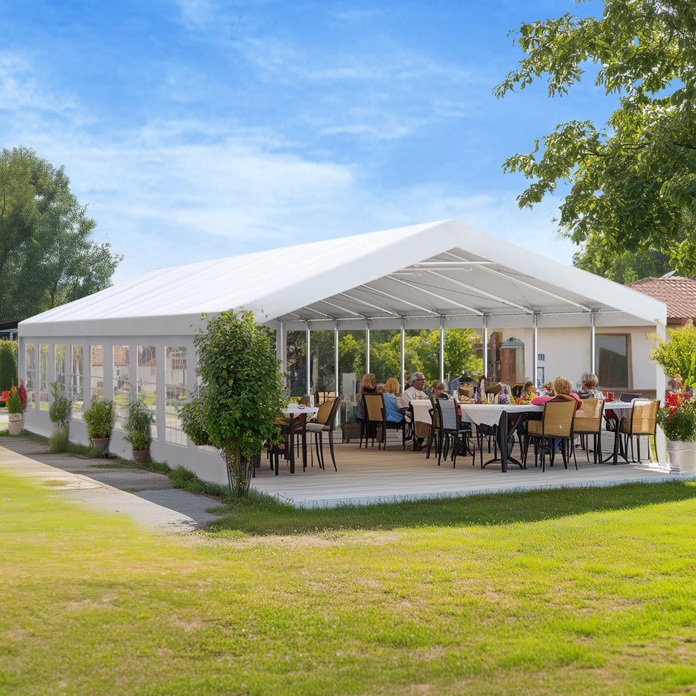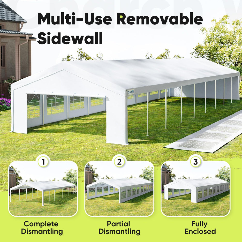 【Premium Material】Constructed with 160g imported PE fabric offering complete waterproof and UV protection. The 20x30ft canopy includes 2 removable sidewalls with chapel-style windows and zippered doors for optimal ventilation.