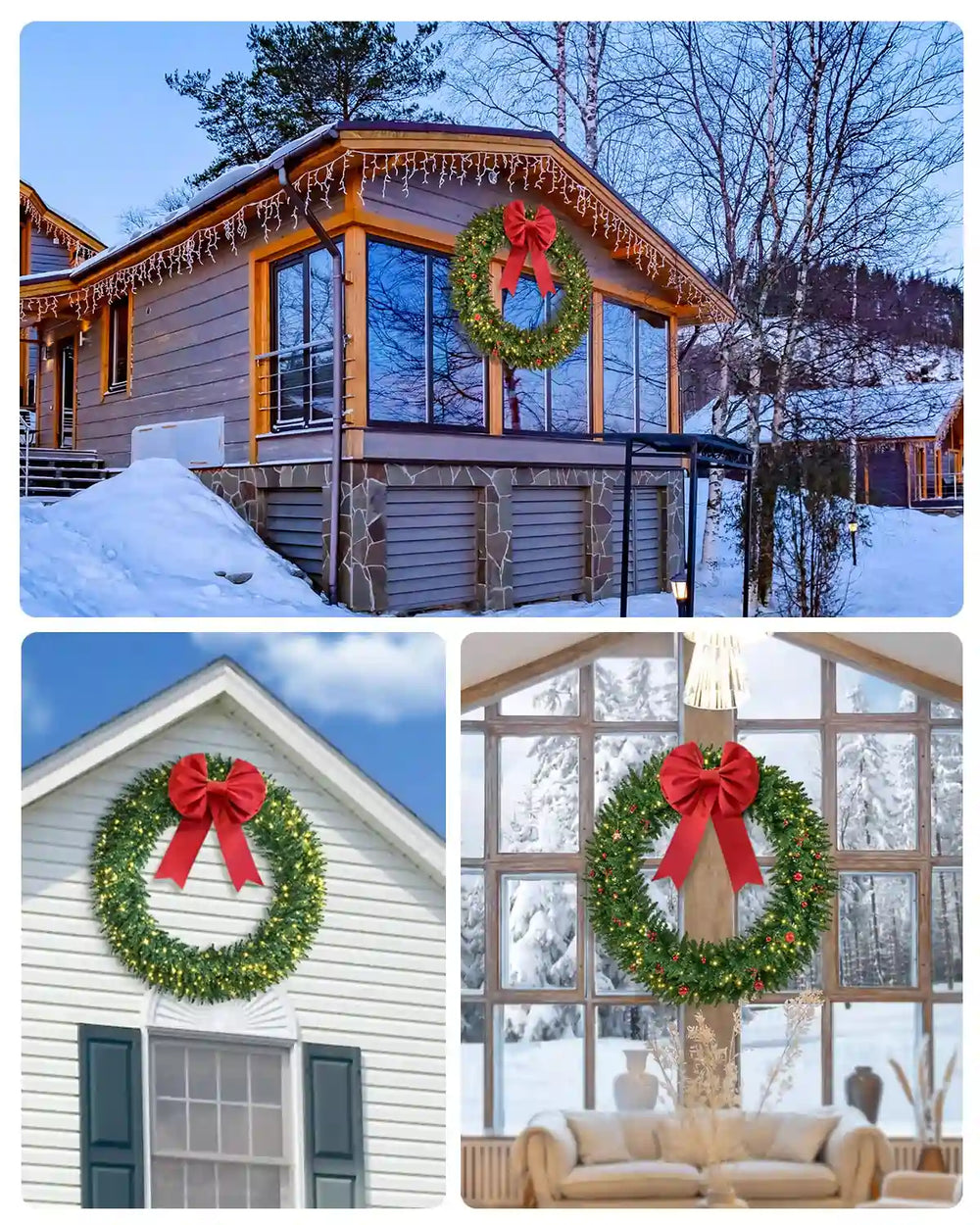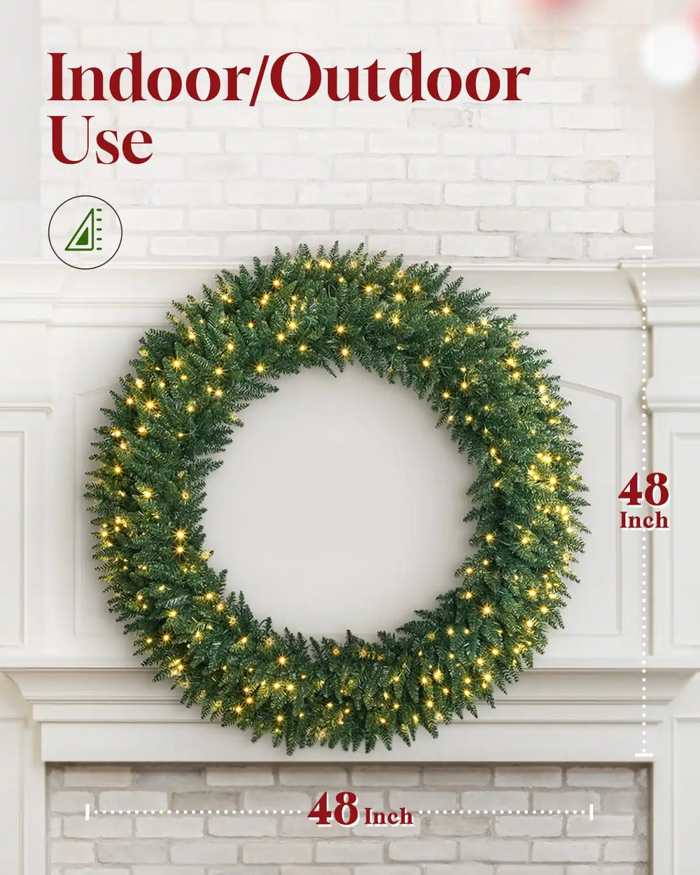 DURABLE AND HIGH-QUALITY. Made from high-quality materials, fire-resistant and weather-resistant needles, Extra large 48''/60" prelight Christmas wreath for home decor is built to withstand various weather conditions. Its sturdy construction ensures durability, making it suitable for long-term use year after year. Whether it's hung on your front door or displayed indoors, this hanging wreath decoration will maintain its beauty and charm throughout the holiday season.